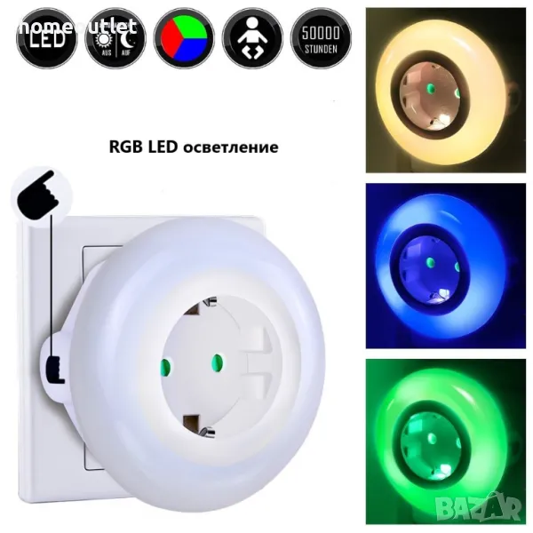 10 лумена топла бяла светлина, без да е твърде ярка, за да ви събуди. 3 цвята, сменяеми автоматично (зелен, син, бял) със сензорен бутон.