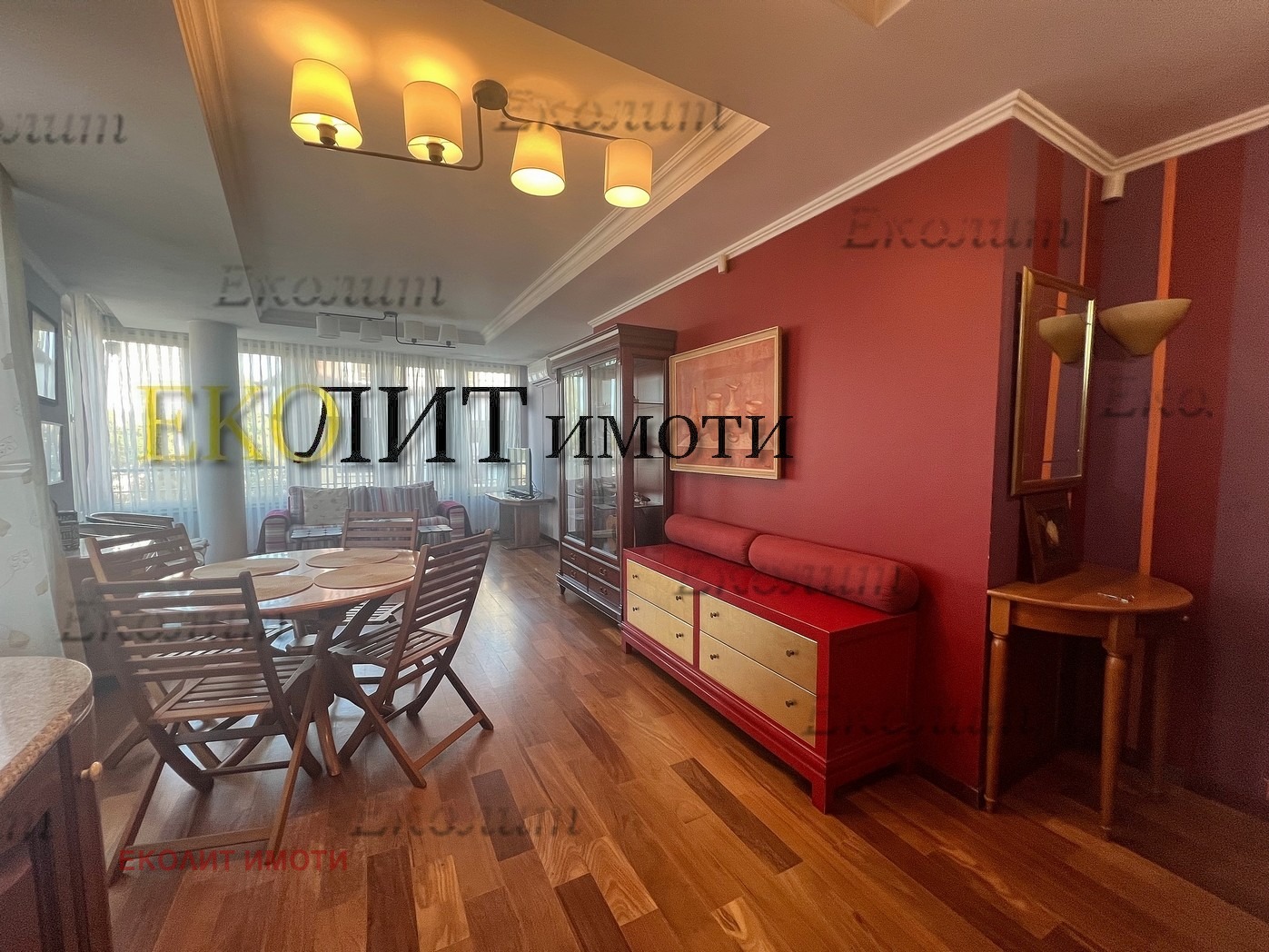 Обзавеждането включва диван, холна маса, раздвижени шкафове, трапезна маса, столове, вградена кухня с бяла техника от висок клас.