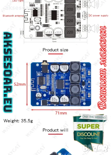 1 x Интегрална платка на цифров сглобен усилвател с мощност 2 по 45 вата
