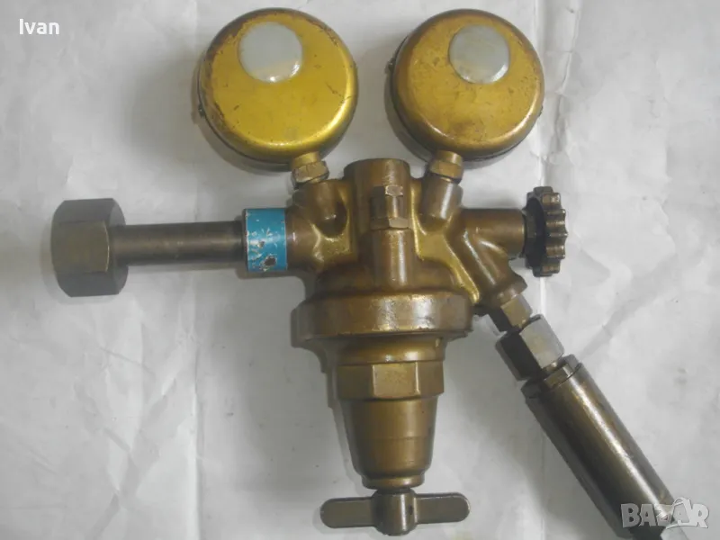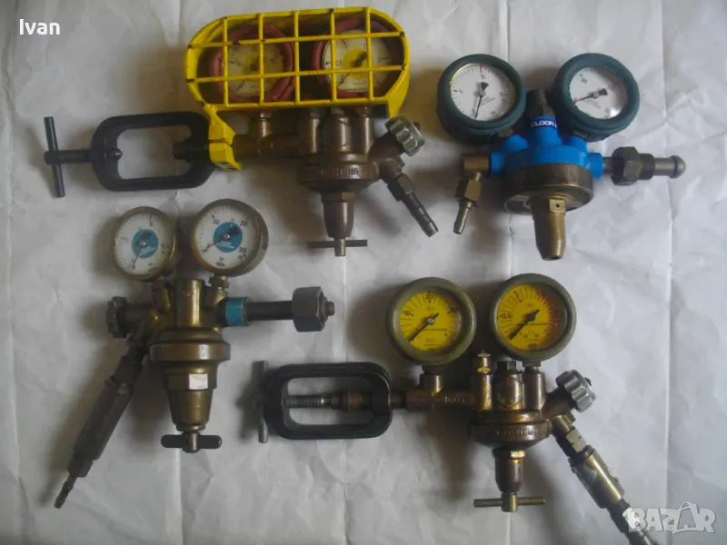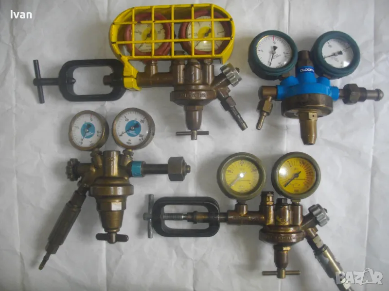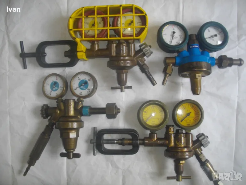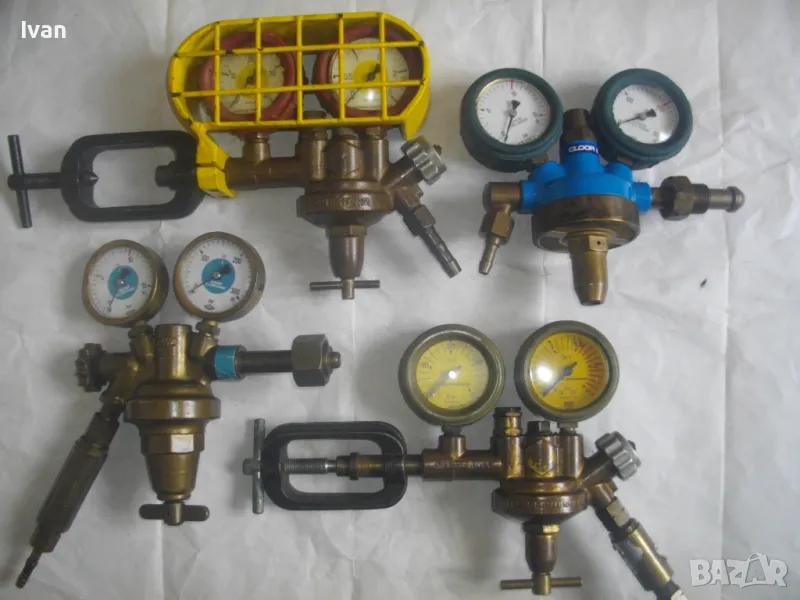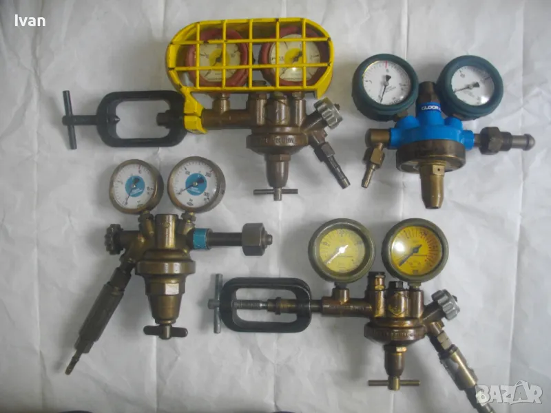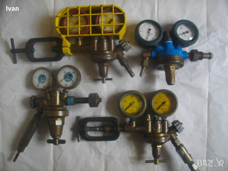 Редуцир вентили оксиженни за кислород и ацетилен. Различни. Цена за кислородов редуцир вентил с 2 манометъра - 179 лв, цена за ацетилен редуцир вентил - 179 лв. Някои са с искрогасител регулатор на налягане. Всички вентили са оригинални, някои от тях са Messer Griesheim, EWO, GLOOR.