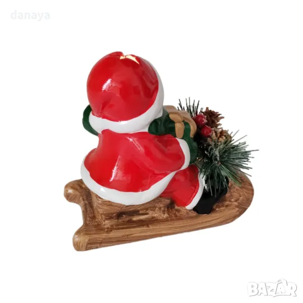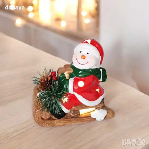 светеща коледна фигура, Дядо Коледа с шейна, Снежко с шейна, керамична коледна фигура, коледна декорация, светеща украса, празнична декорация, коледен интериор, елхови клонки и шишарки, коледни фигурки, коледен подарък, зимна украса, светеща керамична фигурка, малка коледна фигура