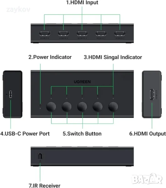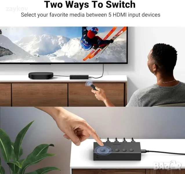 UGREEN HDMI превключвател 5 в 1 изход 4K@60Hz, HDMI сплитер с дистанционно управление