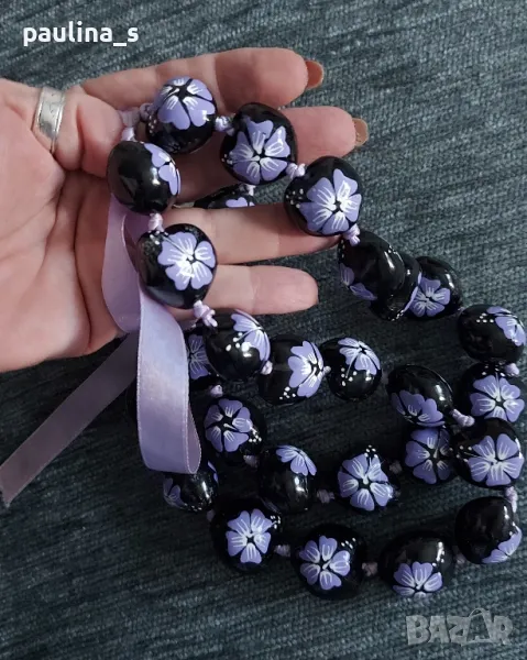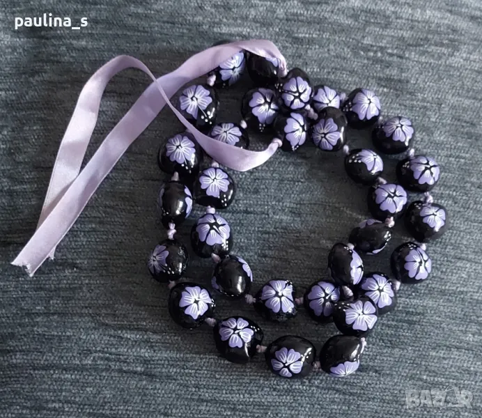 3️⃣. Ръчно изработен колан от черни мъниста с лилави цветя, не е нов, без дефекти / дължина 94см + 2х20см за връзките - цена 29,99лв / 15 евро.