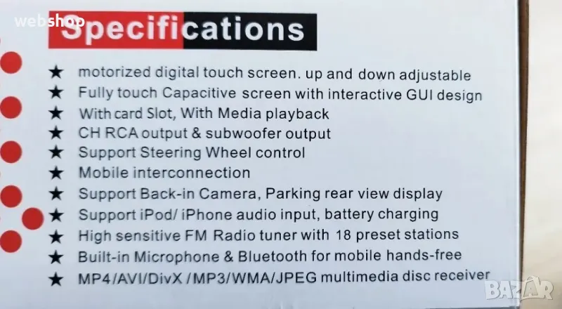 Съвместимост: Универсална; Тип: 1DIN; Съхранение: 1 GB вътрешно, разширяемо до 16 GB чрез USB; Свързване: Bluetooth, WiFi; Аудио изход: 4x45W;