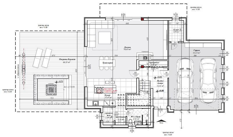 Етаж 1 - двоен Гараж, Коридор, Дневна с трапезария и кухня, санитарен възел, сервизно помещение и голяма покрита веранда.