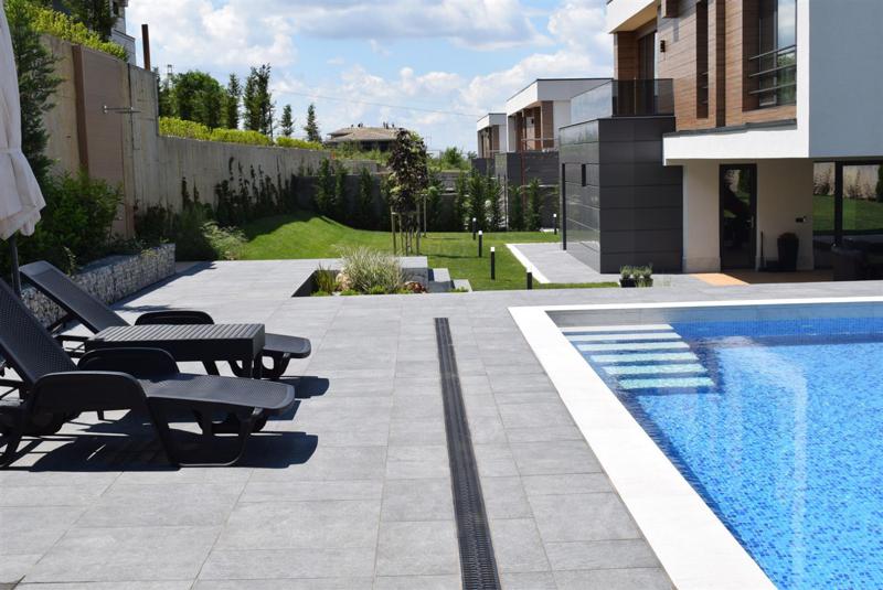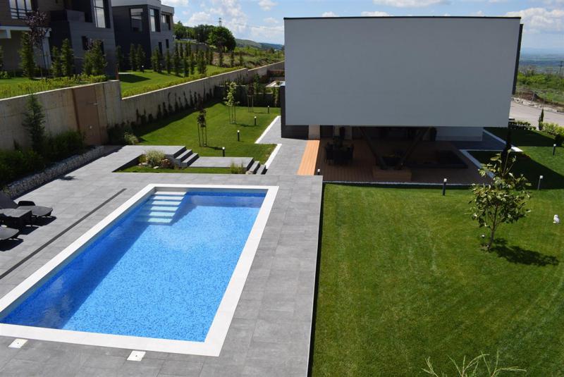 Отвън: Напълно завършен изграден и ограден двор, озеленяване на целия двор, изградени и функциониращи подземна поливна система, градинско и фасадно осветление, напълно изграден и функциониращ БАСЕЙН с размери 8х4м.