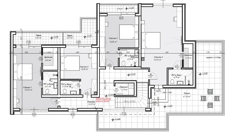 Етаж 2 - 4 спални всяка от който със санитарен възел и тераса, 2 от тях и с дрешник, коридор, Перално помещение и тераса.