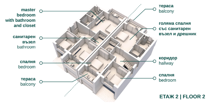 Етаж 2 - 3 спални от който 1 основна със собствен санитарен възел, дрешник и тераса, общ санитарен възел за другите 2 спални, тераса към спалня 2, коридор.