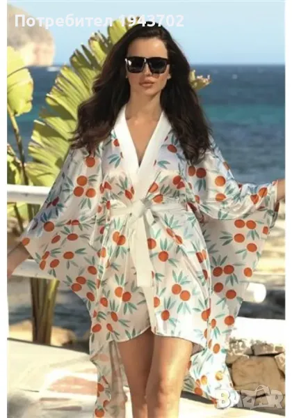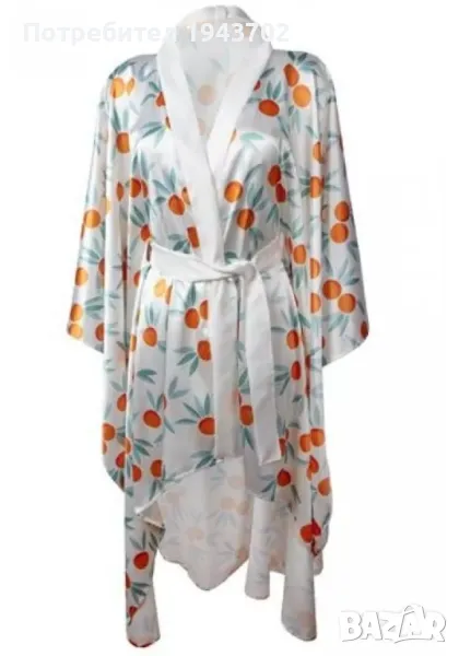 Халатът е изработен от приятен на допир сатен. Моделът е с дълги, широки ръкави, дължина на предната приблизително до средата на бедрата, а на задната до средата на прасците.