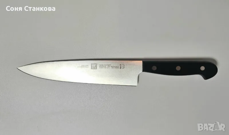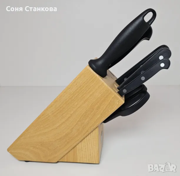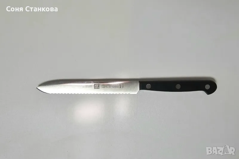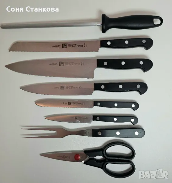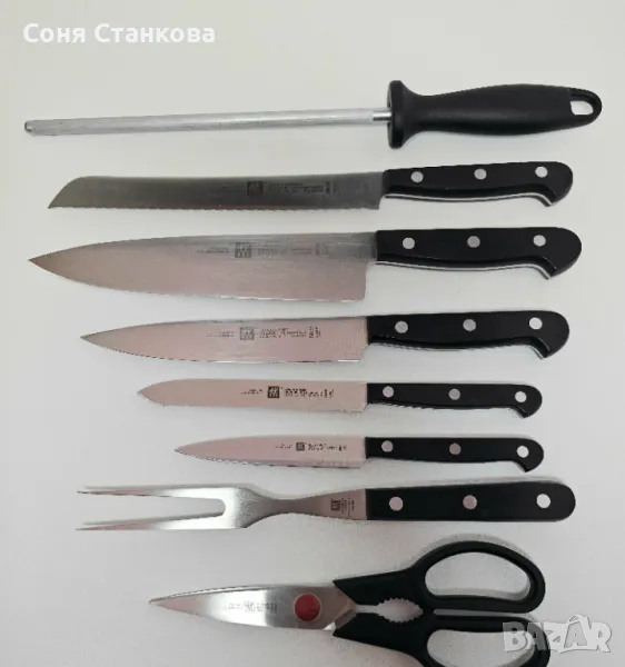 Комплектът е на марката Zwilling , серия Twin Gourmet. В много добро състояние, с леки следи от употреба, няколко драскотини по блока. Остриетата на всички ножове са след наточване при професионален точилар.