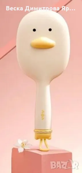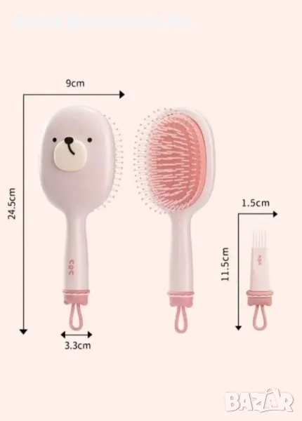 Размери на четката за коса: 24.5 х 9 см;Размери на четчицата за почистване: 11.5 х 1.5 см;Специална особеност: Дръжка за лесно закачане; Вариант 1: Розово с акцент на мече;Вариант 2: Жълто с акцент на пате.