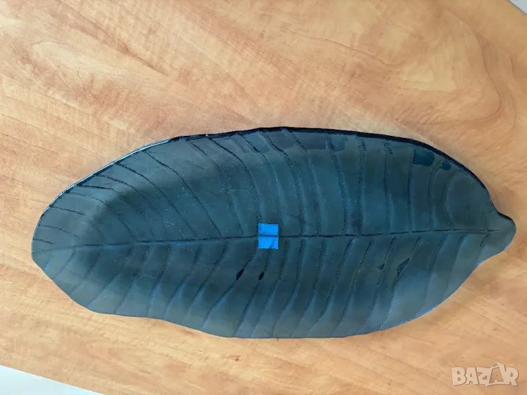 Продавам плато от синьо стъкло във форма на листо. Подходящо за плодове, храна, дребни украси. Платото е 60 см, ново, с кутия и опаковка.