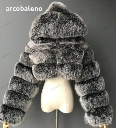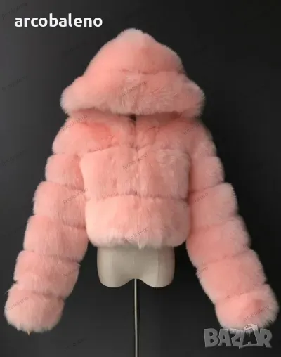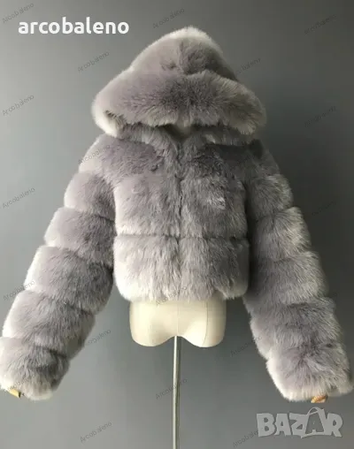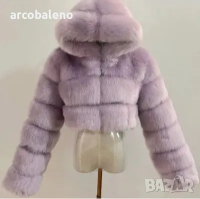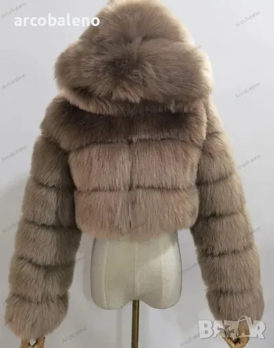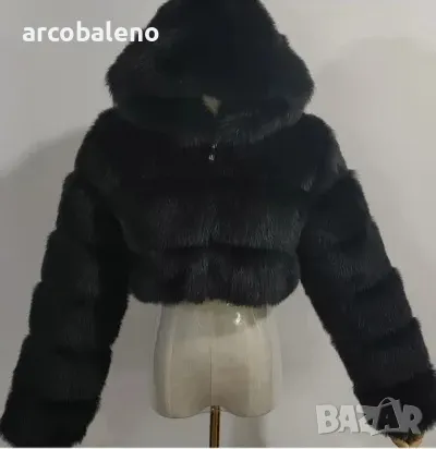 Късо дамско палто от изкуствен косъм с качулка и дълъг ръкав