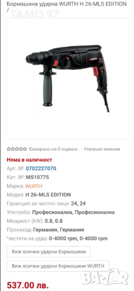 Продавам електрически перфоратор на Вюрт със сменяем патронник в много добро визуално състояние и работи отлично, оригинално немско производство внос от Франция. Продава се така както си е на снимките само машината без куфар. Пращаме с преглед и тест с куриерска фирма еконт може и лично предаване за гр. Шумен. Магазинската цена е: 537лв