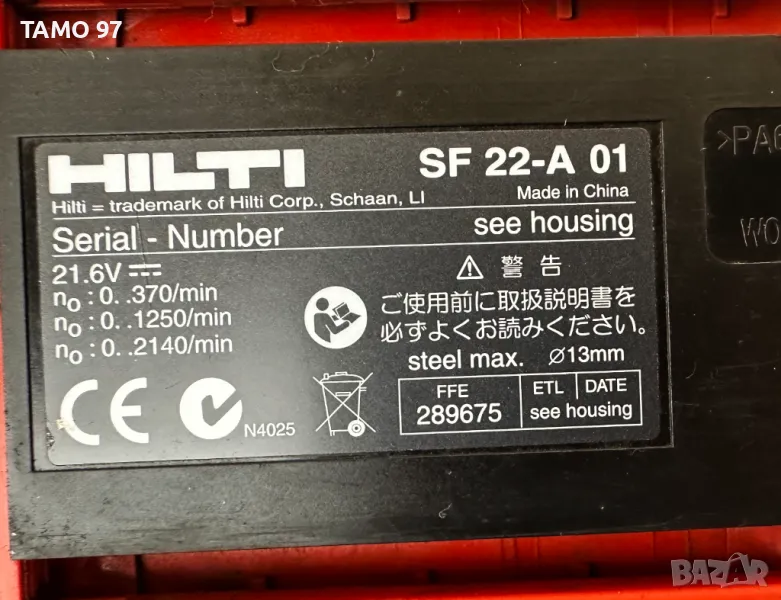 Хилти с козметични следи от използването, но си работи отлично и без забележки, внос от Франция. Обявената цена е за машината с две батерии по 22V 5.2Ah с индикатор и комбинирано зарядно, може и всичко по отделно само тялото за 150лв, батерии по 150лв и зарядно 180лв.