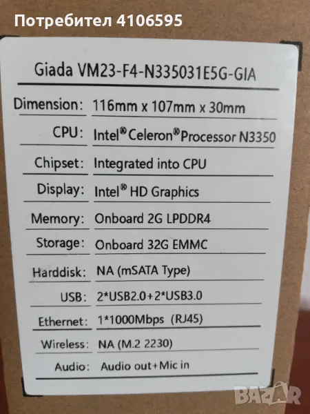Едноплатков компютър Giada VM23-F4-N335031E5G-GIA → Обява 47561556