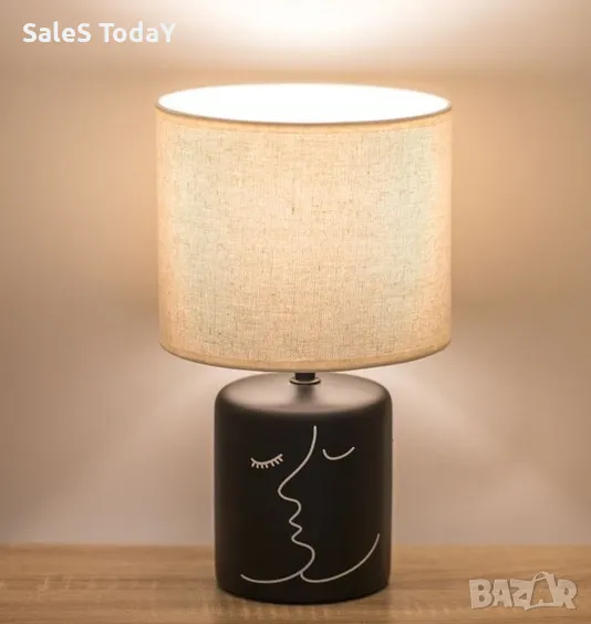 Настолна лампа, Черна, керамична, лица, Бежова шапка