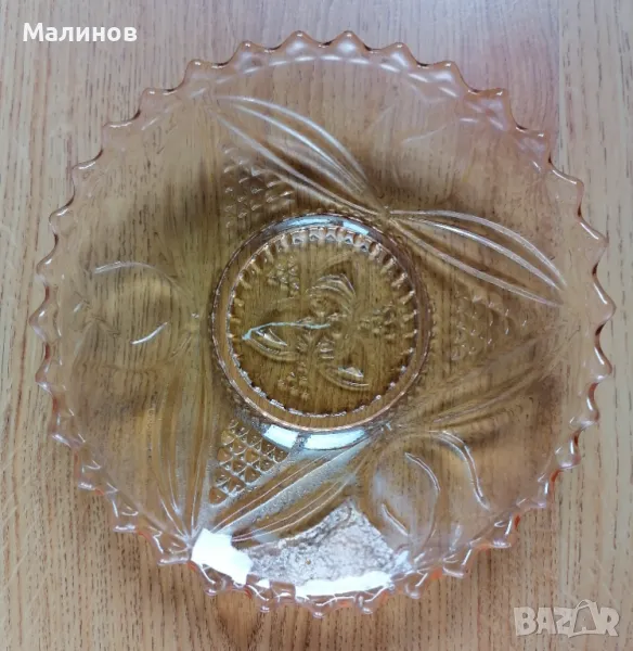 Тортени чинийки, 6 броя, кафеникаво стъкло, отдолу изцяло с флорални инкрустации, 17 см. Има налично плато - чиния около 40 см, със същите инкрустации и цвят, отделно на същата цена.