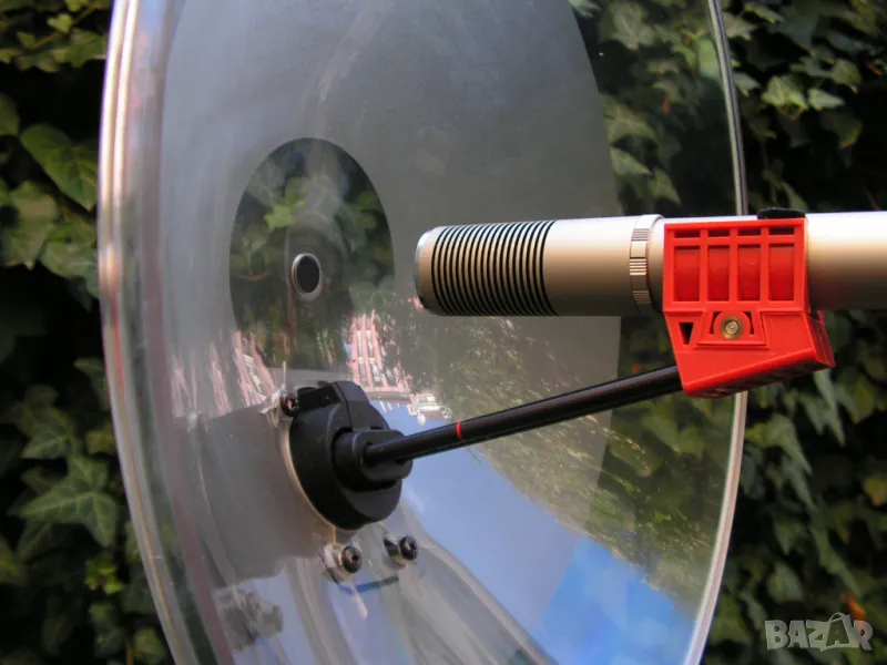 когато китайските ръчички още произвеждаха добре само ориз. Рефлекторът е полиран от вътрешната страна, а на сгъваемия носач за микрофона има винтова щипка и специални маркировки за мястото, където трябва да е равнината на микрофонната шпула / т.е. фокуса на параболичния отражател /. Параболата с микрофона може да се държи с ръка, както и да се фиксира към стойки и други носещи устройства. В долния и край има резбови отвори чрез които, заедно с двата адаптера, които предлагам в комплекта, ще можете да ползвате всякакви професионални крепежни устройства. В долния край на отражателя има щипка за микрофонния кабел, която поема теглото и вибрациите му. Параболичния отражател може да работи със всякакви микрофони, включително стерео, като е много приятен и за различни акустични експерименти.