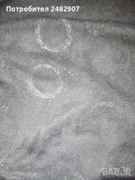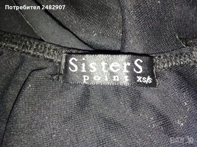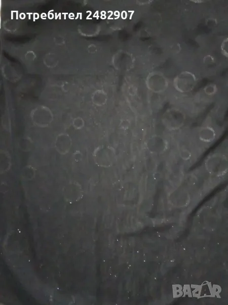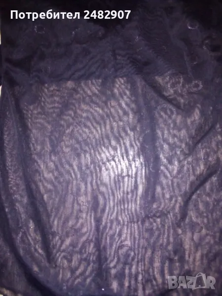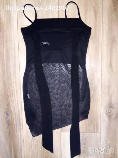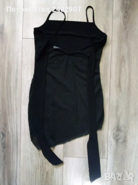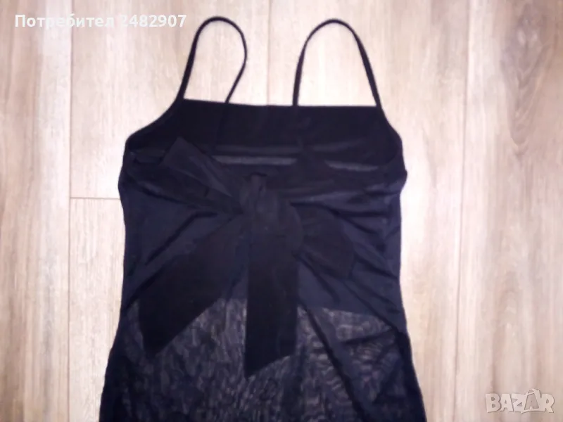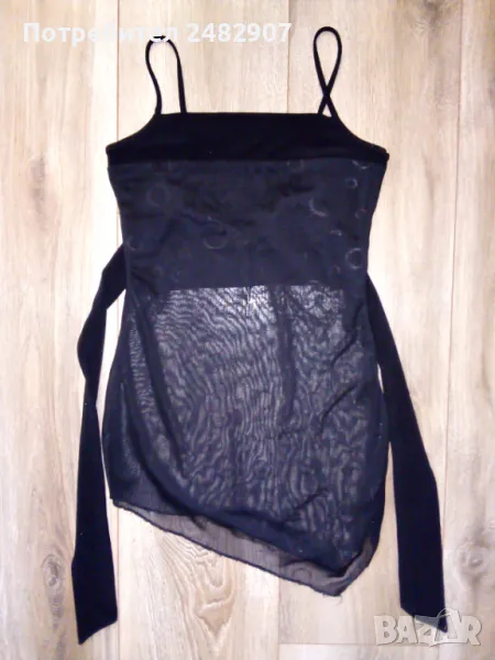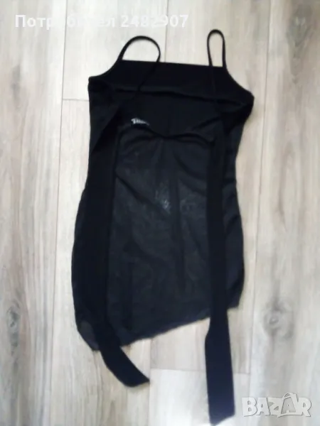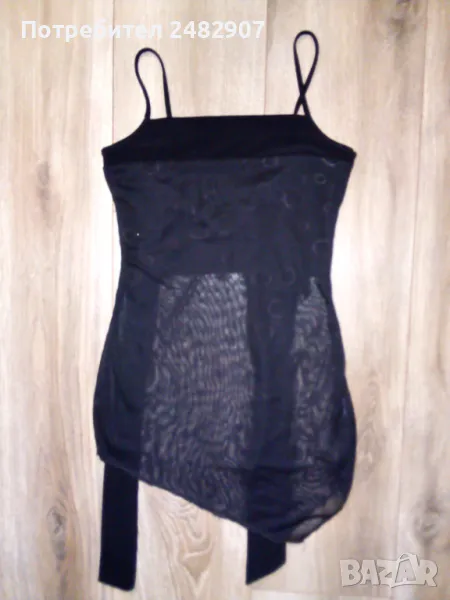 Черен дамски потник с тънки презрамки, блестящ ефект и широки връзки на врата, размер XS. Ширина под мишниците - 33 см, ширина в долната част - 40 см, дължина от под мишниците до долу - 41-43 см. Много запазен, почти не е използван, с подплата на бюста и прозрачен ефект, леко еластичен.