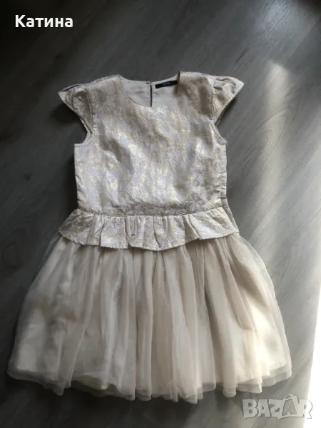 Уникална рокля в златисто.Закопчава се с цип в страни.Размер на етикета 158-164 см,13-14 г.Обличана веднъж по повод.
