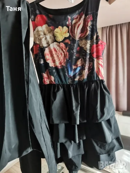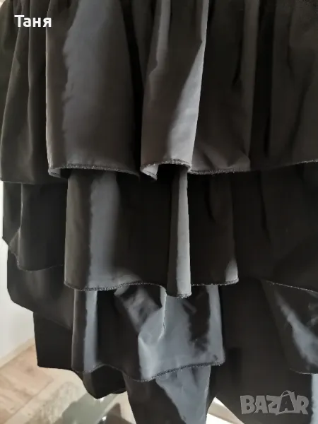 Продавам рокля на марката Pause, по етикет размер S. Дължина 86 см,гръдна обиколка измерена едностранно 42 см. Воланите в долната част на роклята са от черен сатен. Към роклята има и шит широк колан.