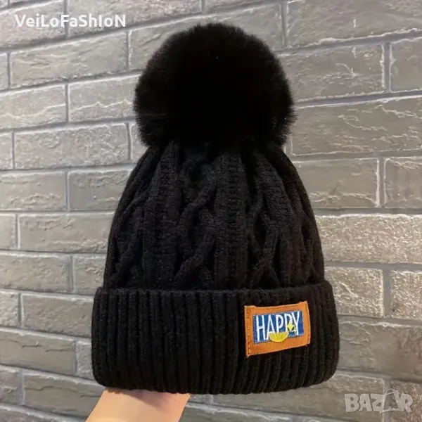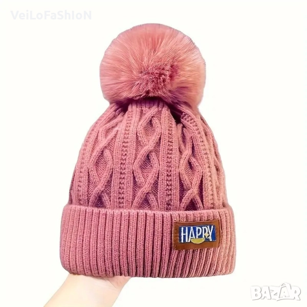 Нова зимна топла шапка в черен, розов или бежов цвят с пух (помпон), подходяща за есенно-зимния сезон. Шапката е подходяща за жени и деца, с плътна и еластична материя.