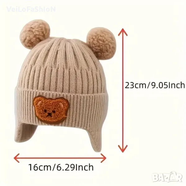 Нова зимна детска шапка тип ушанка с Мечешки уши (Мече) в кафяв цвят, подходяща за есенно-зимния сезон. Шапката е подходяща за деца от 9 месеца до 2 години.