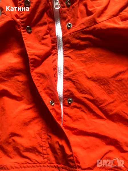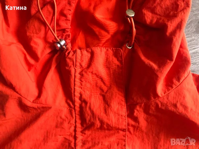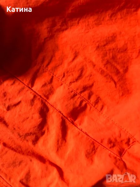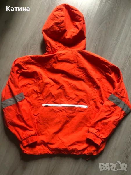 Суитшърт в оранжев цвят,от шушлякова материя,със светлоотразителни елементи.Три джоба в предната част,и един на гърба.Има лека подплата.Размер на етикета М.Нов,само е изпран.