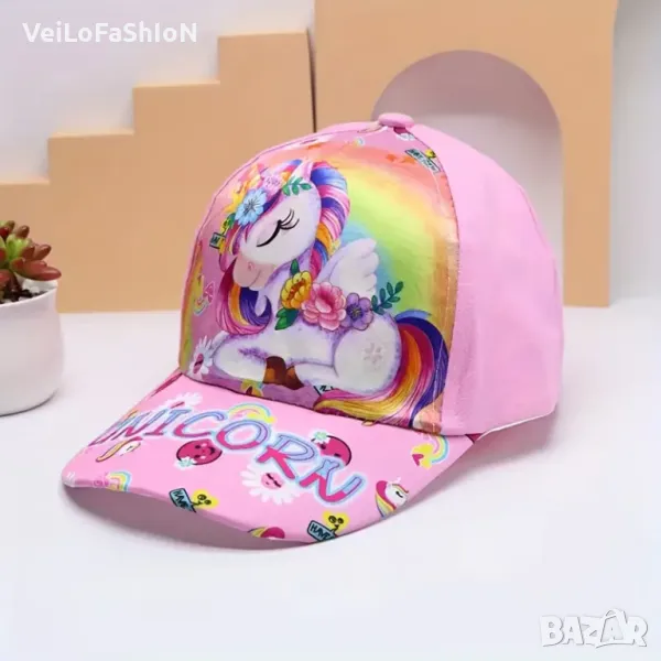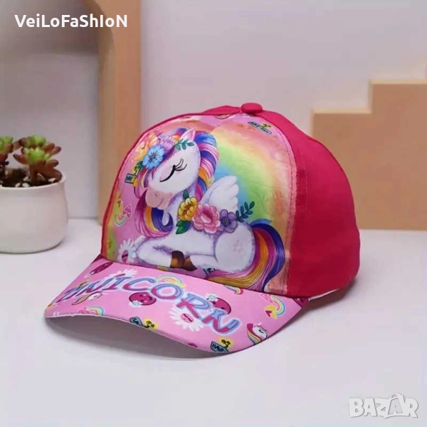 Нова детска шапка с козирка в розов цвят или цвят циклама с Еднорог. Подходяща за деца от 3 години до 14 години, поради регулиращата се ширина.