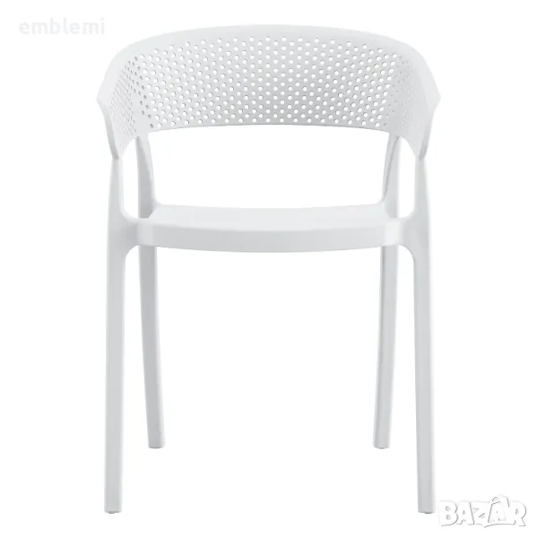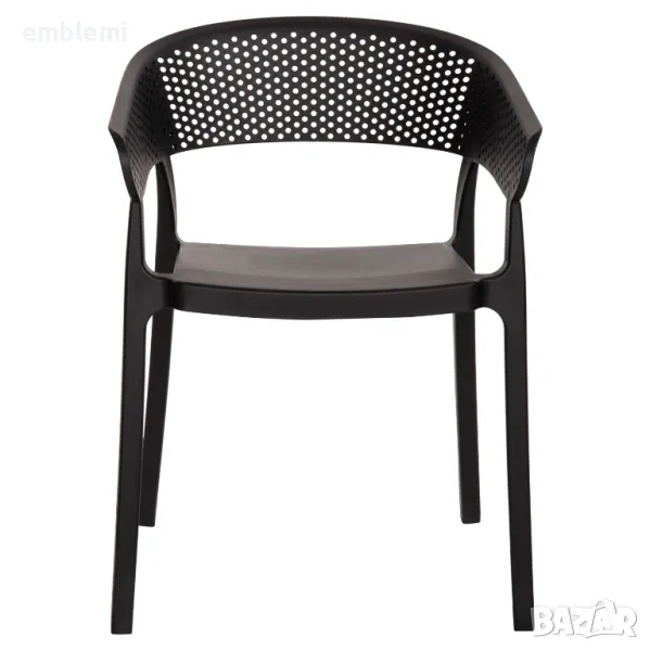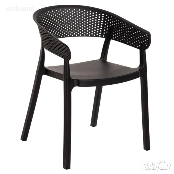 ЧЕРНО полипропиленово кресло. Идеално предложение за използване във външни пространства, както професионални (банкети, кетъринг компании и др.), така и у дома. Фотьойлът се състои от гладка седалка и полукръгла, независима и "перфорирана" облегалка и ръце. Той е красив и ще обнови естетически всяко външно пространство.