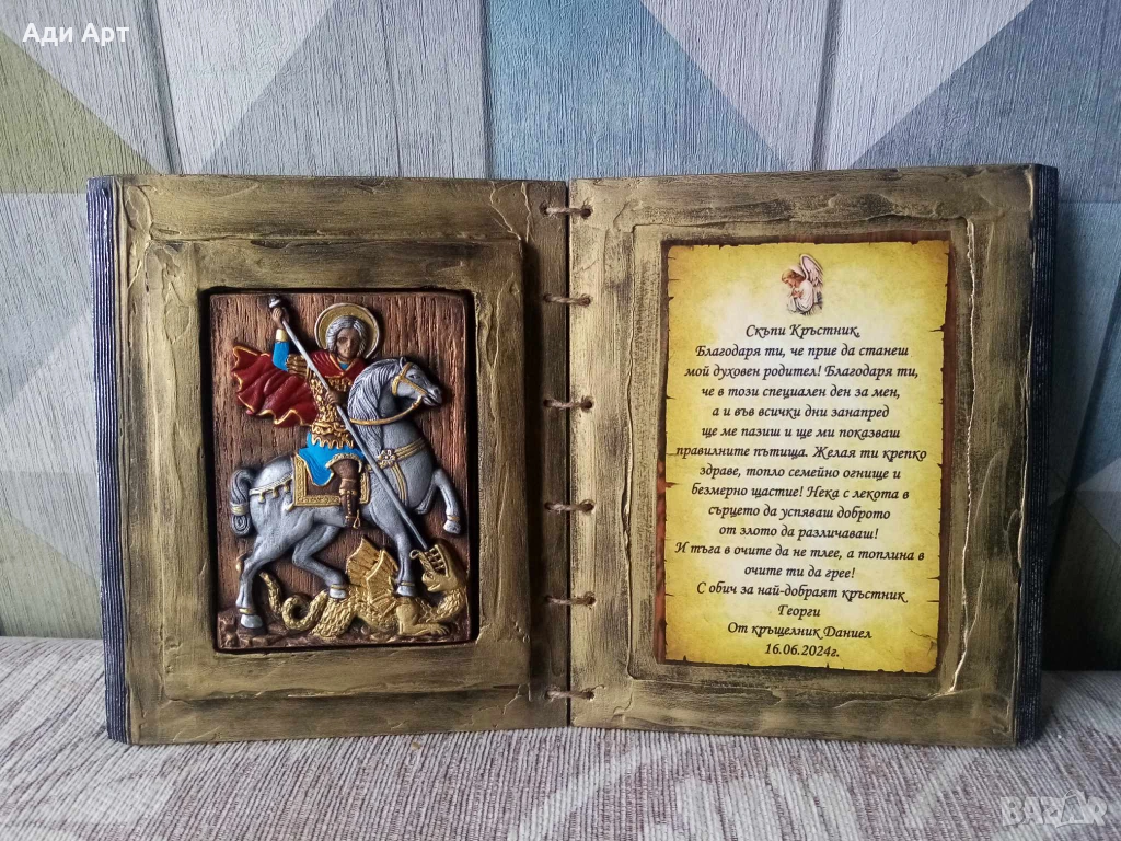 Релефна икона която е подходящ подарък за кръстник или кръстници,нов дом, юбилей и имен ден размера е 22 на 37см. може и снимка на детето да се добави