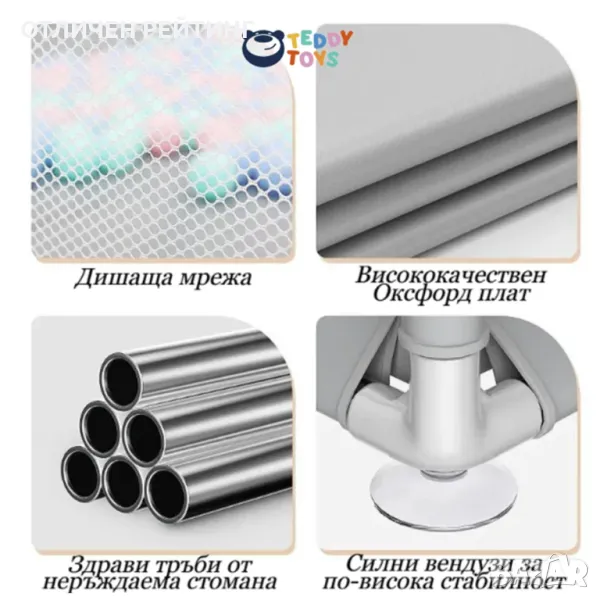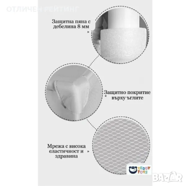 ПРЕДИМСТВА: Детската кошара може да се използва както на закрито, така и в двор, градина и др. Изработена от стабилна конструкция и плат Оксфорд, който може да се пере. Бързо и лесно сглобяване и разглобяване. Заема малко място, когато е сгъната. НАДЕЖДНОСТ - кошарата е конструирана от тръби от неръждаема стомана (не са пластмасови), използват се и широки стойки, които правят конструкцията на манежа стабилна и неподвижна. ВИДИМОСТ - прозрачната мрежа ни дава поглед на случващото се вътре в кошарата, а също така осигурява правилна циркулация на въздуха. Входът е с троен цип, който позволява лесно и бързо влизане и излизане от нея. БЕЗОПАСНОСТ - позволява на детето страхотно, удобно и безопасно забавление и дава на родителите момент за почивка. Входът е с троен цип, който позволява лесно и бързо влизане и излизане от нея. Всички части са допълнително закръглени, което минимизира риска от нараняване дори в случай на директен динамичен контакт. Подходяща за ограничаване на безопасна зона за движения и игри.