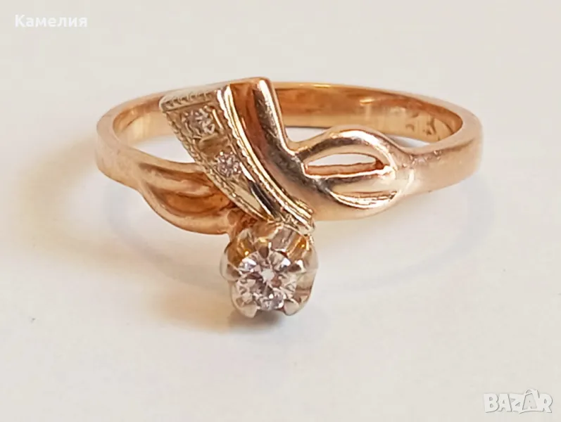 Златен винтидж пръстен с брилианти. Проба 585 каштан. Диаметър 17 мм. Грамаж 2,81 грам. 1бр-0,09сt, 2бр-0.03сt.