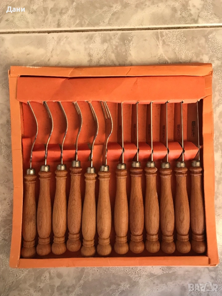 Комплект прибори Боженци,състоящ се от 6 вилици и 6 ножа.Производител е завод"Петко Денев" -гр.Габрово.Дръжките им са дървени.
