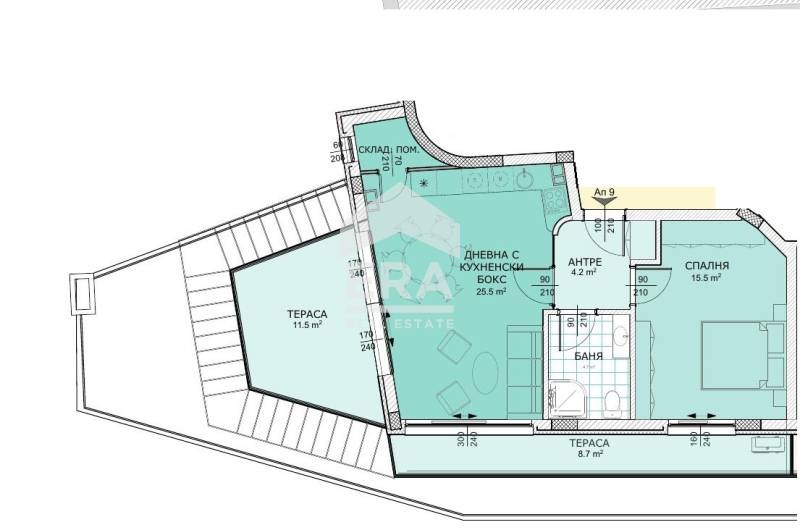 Обявеният апартамент е с 78.83 кв.м застроена площ и 92.85 кв.м. с общите части. Намира се на пети етаж от общо пет. Жилището има следното разпределение: коридор, дневна с кухненски бокс и трапезария, спалня, баня с тоалетна и две тераси.