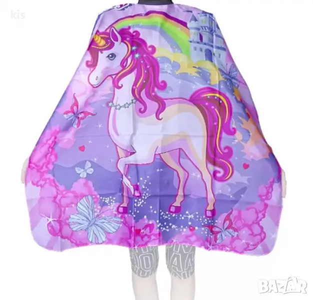 Детска пелерина за подстригване с интересна и забавна щампа. Пелерината е водоустойчива и е подходяща за деца. Закопчава се чрез метални кукички, които не ѝ позволяват да се размества или смъква.