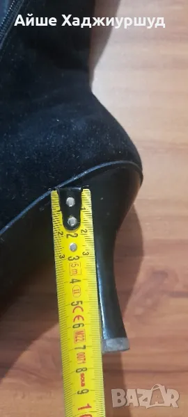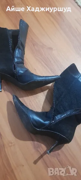 Елегантни дамски ботуши от естествена кожа и велур.Железен ток,остър връх,топла вата,цвят черен.Височина на тока-7 см.Не са подходящи за дебел прасец.