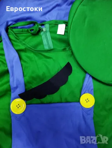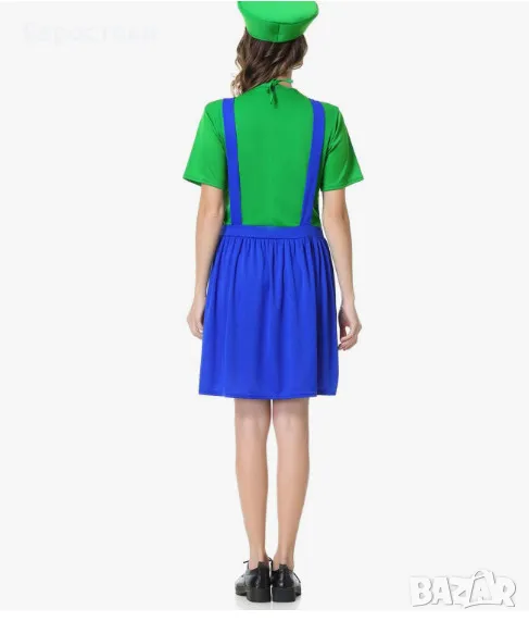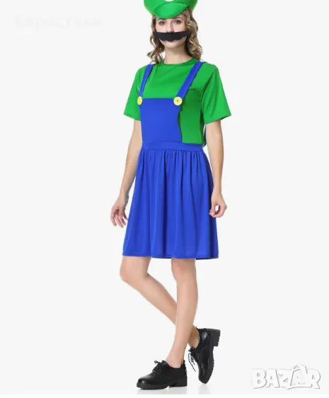 Дамски костюм на Super Mario Luigi включва зелено-синя рокля с дизайна на известния гащеризон на Луиджи, зелена шапка и сомзалепващи мустаци.