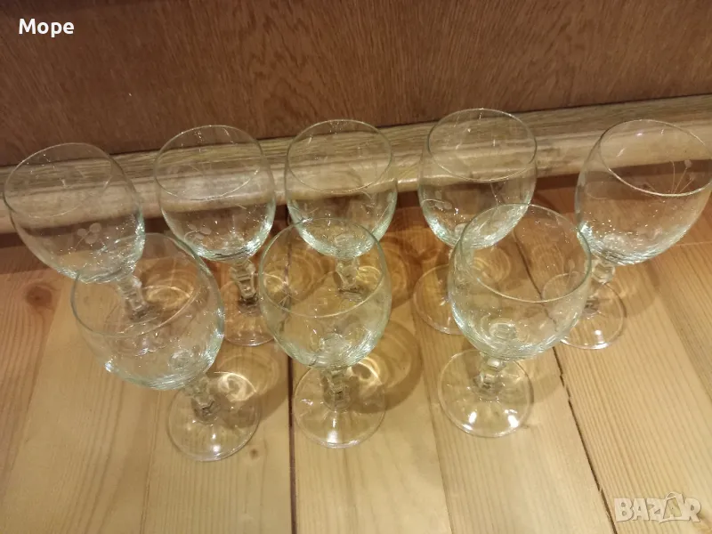 Осем броя кристални чаши със столче, с орнаменти на цветя в отлично състояние без забележки с височина 15 см. диаметър на отвора 5,5 см. диаметър на основата 6 см. вместимост 120 мл.