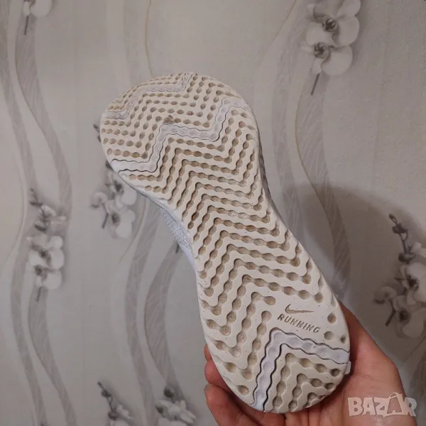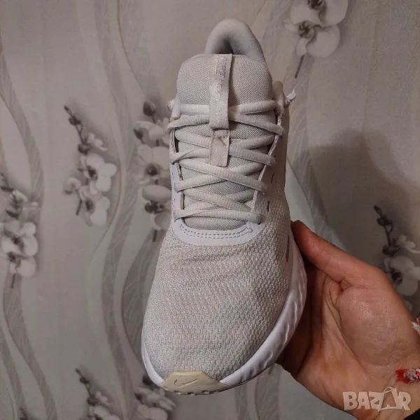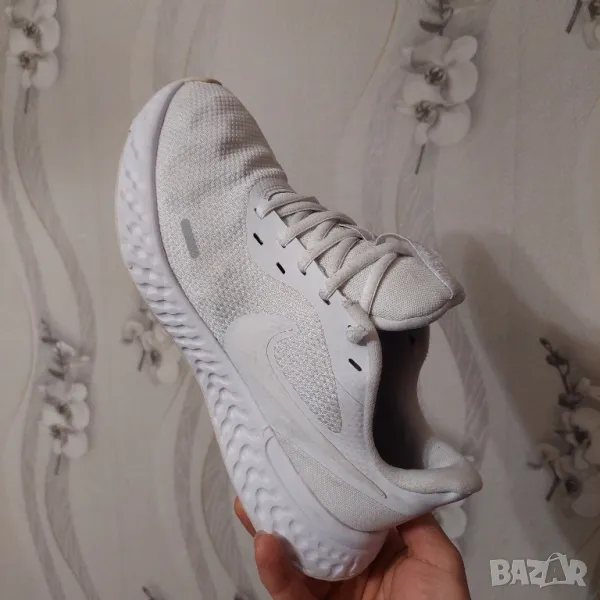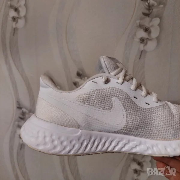 Страхотни мъжки спортни обувки NIKE в бял цвят, изработени от висококачествени дишащи материали. Nike Revolution 5 може да ви осигури максимален комфорт с изработената подметка от висококачествена гъвкава гума и омекотяваща пяна в междинната подметка. Горната част е изградена от лека, дишаща материя. Моделът разполага с връзки за персонално коригиране на ширината. Маратонките са подходящи както за спорт, така и за ежедневието. Много добре се съчетават със спортен екип, дънки или къси панталони.