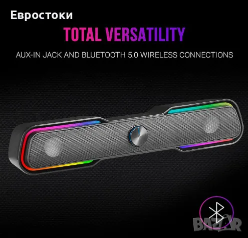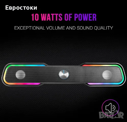 Саундбар Mars Gaming MSBX, тонколона за компютър с RGB подсветка, Bluetooth 5.0 + жак 3.5, USB, DSP Sound, 10W, цвят: черно.