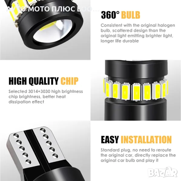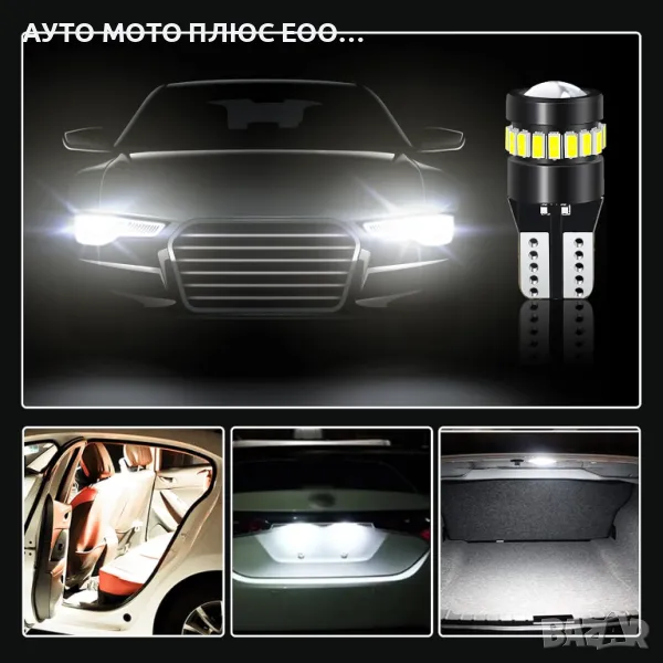 Комплект LED крушки T10 W5W Canbus 18 SMD, 12V, 3014 за габаритни светлини, таван, багажник, сигнализация, огледала, амбиентни светлини, бяла светлина 6000k. Дизайн без полярност, нискотемпературен алуминиев радиатор от авиационен клас, вграден IC с постоянен ток за по-дълъг живот, широко напрежение и ниска консумация на енергия. Лесна за инсталиране, включете и пуснете. T10 LED крушки, вградени във високопрецизна платка със стъклени влакна, бързо разсейване на топлината.