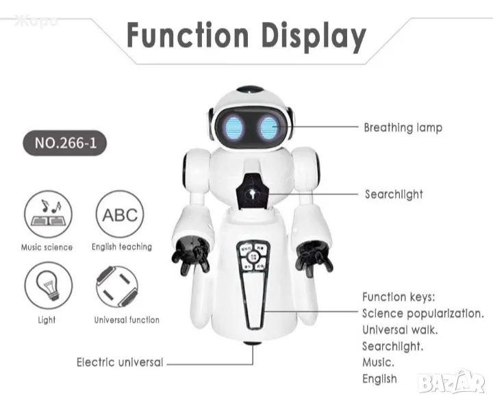 -Роботът може да пее и танцува има и опция контрол силата на звука