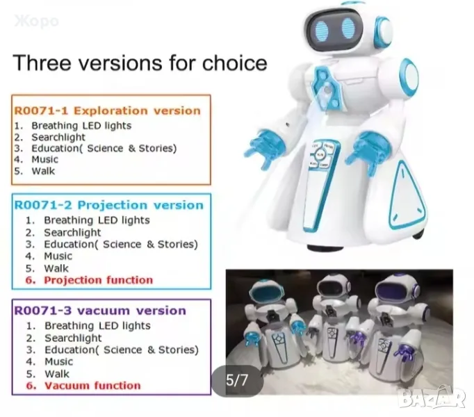 -Роботът може и да почиства и стаята на детето превръщайки в прахосмукачка както и да свети като нощна лампа -Роботът може да разказва истории и да прожектира снимки