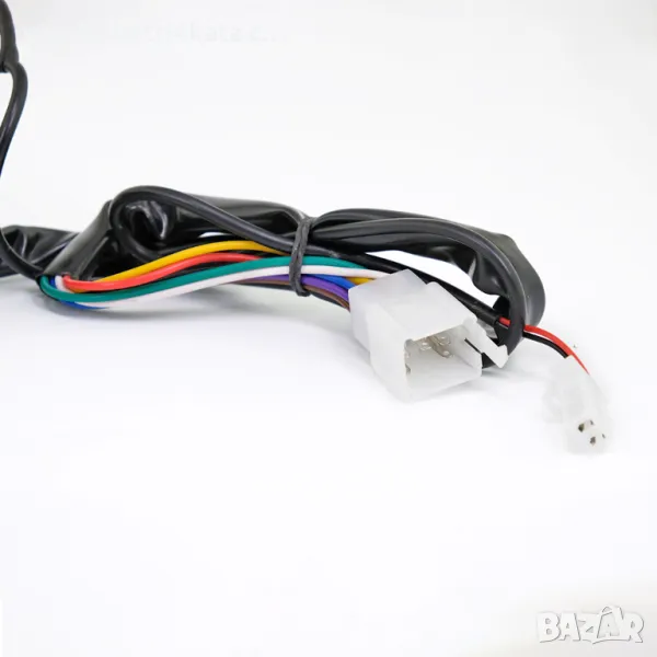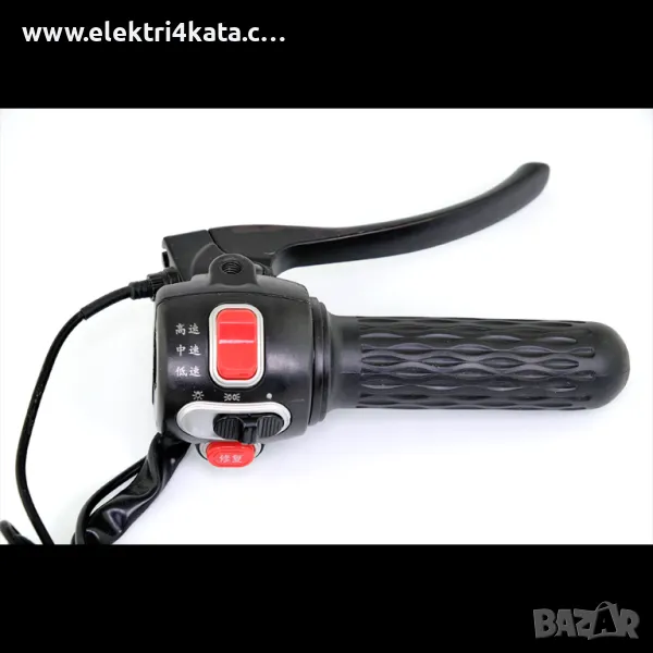 Комплект за управление със спирачни ръкохватки на за електрически скутер е предназначен за управление на електрически скутери и триколки. На дясната ръкохватка за газта (масур) са разположени бутоните за управление на трите скорости, бутонът за светлините и бутонът за стартиране на скутера, осигурявайки удобно и бързо управление. На лявата ръкохватка се намират бутоните за мигачите, клаксона и дългите светлини, които улесняват сигнализацията при движение. Двете ръкохватки са снабдени със спирачни лостове за безопасно спиране и контрол на скоростта.
