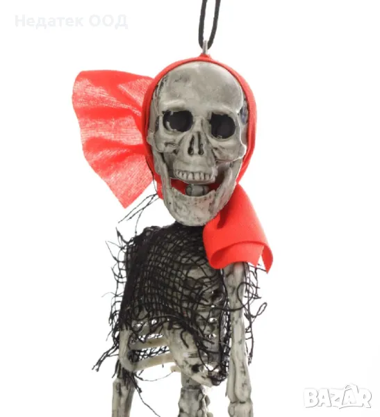 Реалистичен пиратски скелет с червен шал и връв за окачване. Специална украса за Хелоуин.