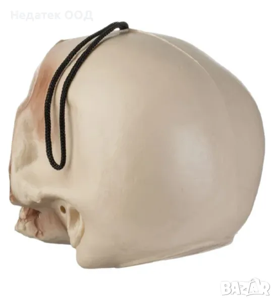 Декоративна висулка с реалистичен череп на скелет в бежово, кафяво и черно с черна връв. Можете да го закачите или поставите, тъй като има и основа.Идеален за най-страшната декорация за Хелоуин!