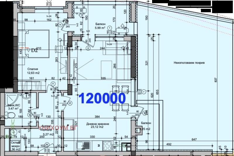 Разпределението е както следва: хол с кухненска част, спалня, баня с тоалетн, мокро помещение и гояма тераса с площ от 60 кв.м.