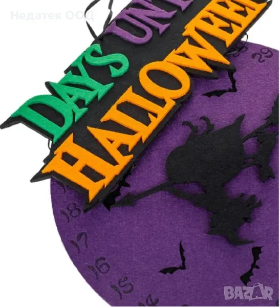Декоративен висящ лилав календар с магьосник в центъра и етикет „ДНИ ДО ХЕЛОУИН“.Идеален за най-страшната декорация за Хелоуин.
